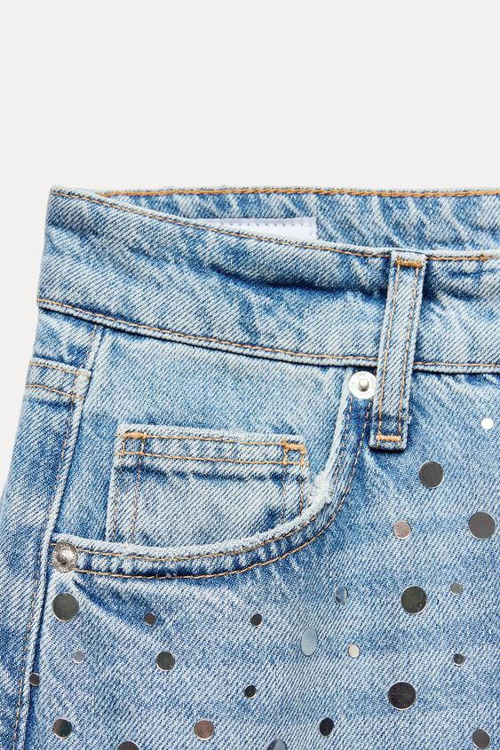 Jeans de tiro medio con cinco bolsillos. Pierna ancha larga. Detalle aplicación efecto espejos. Cierre con cremallera y botón metálico.